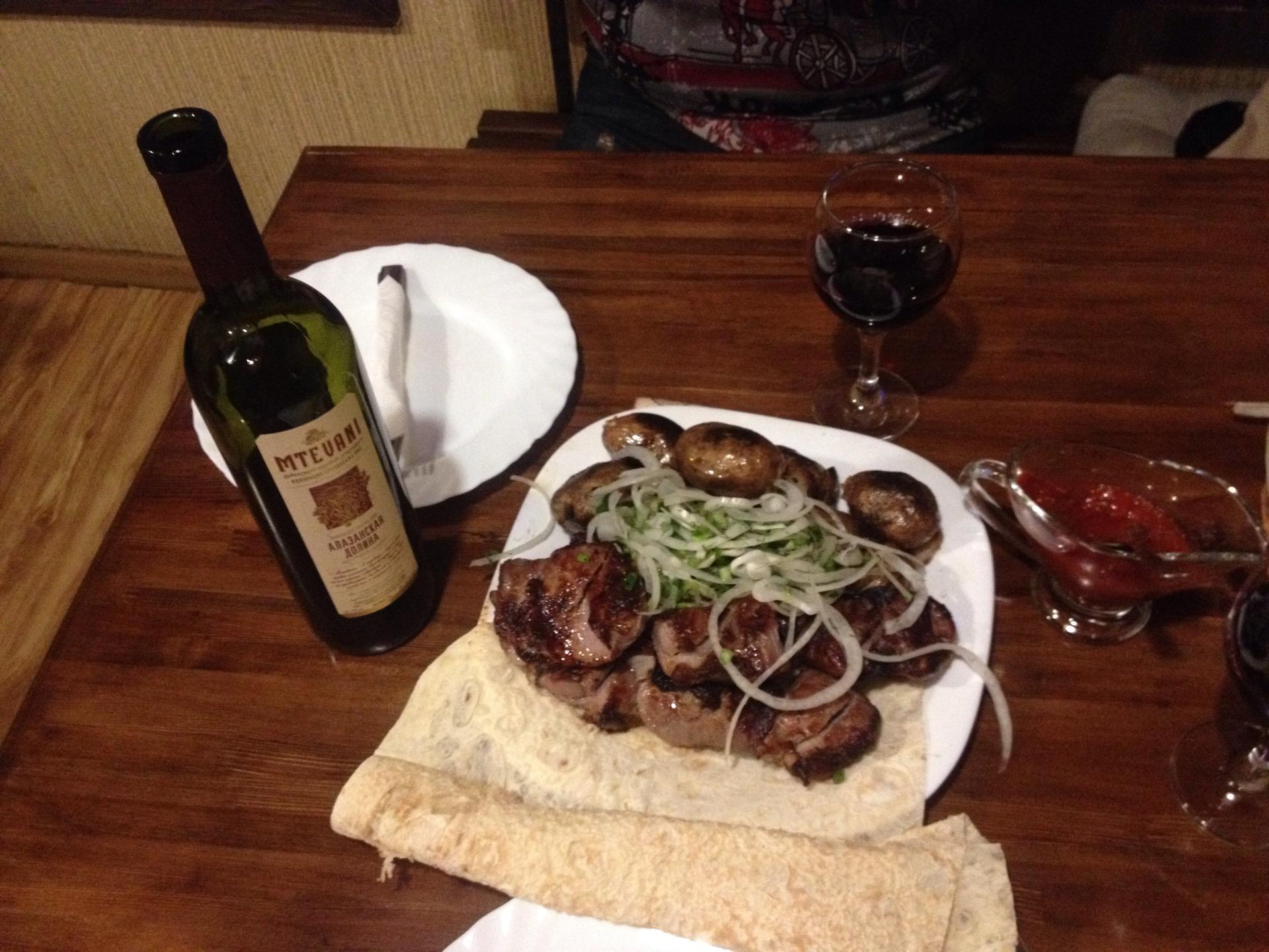 Заказывали шашлык из свинины, люля кебаб из баранины, печень и овощи гриль. Все очень вкусно!!! Особенно люля-кебаб! Соответствие цена-качество превосходное!